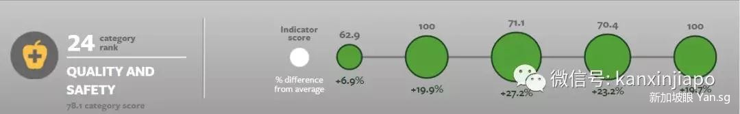 食品质量与安全指食品的品种多样、营养均衡、安全可靠等,新加坡排名第24位,得分为78.1分。第一名葡萄牙得分87.3分。