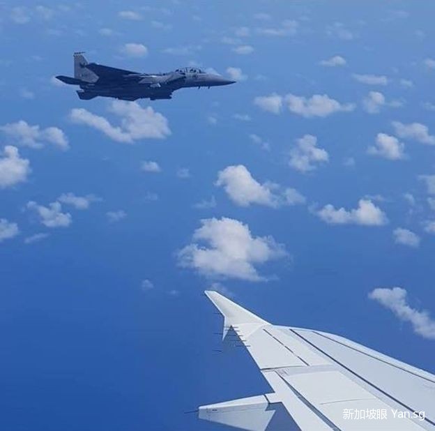 接到警报,两架新加坡空军部队F-15SG战机紧急升空,从南中国海海域一路护送该班机返回新加坡。