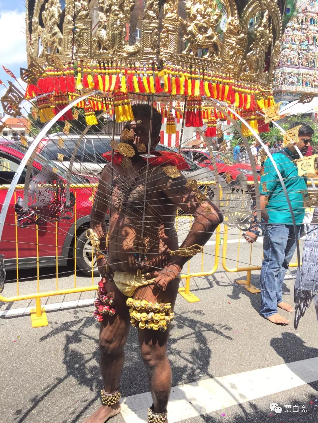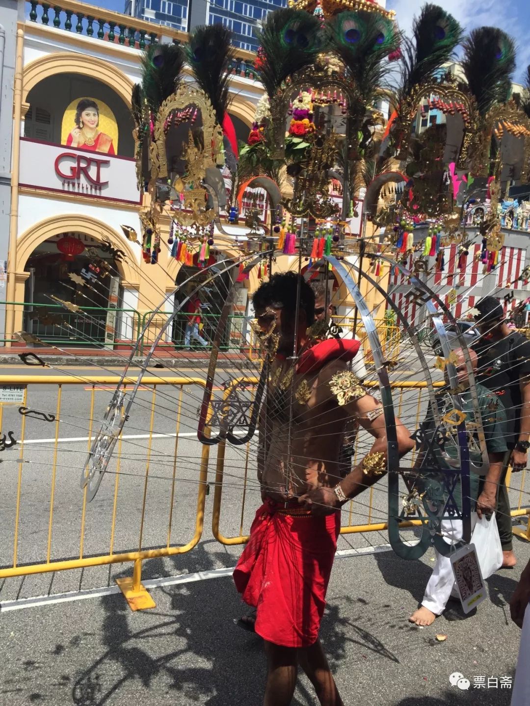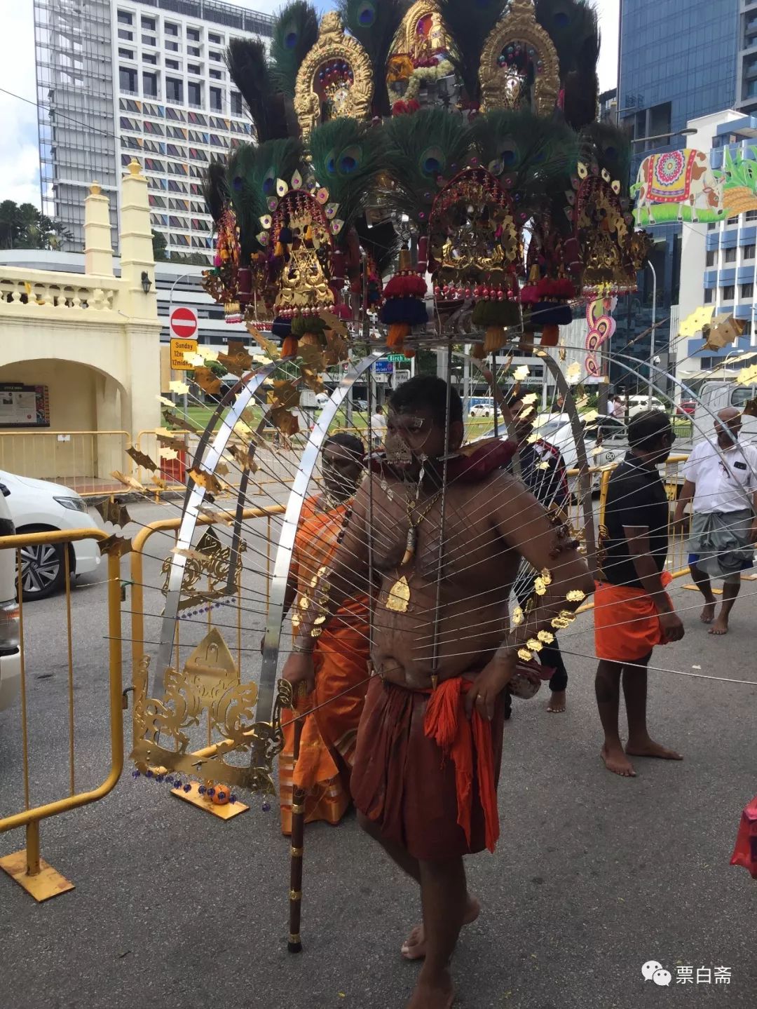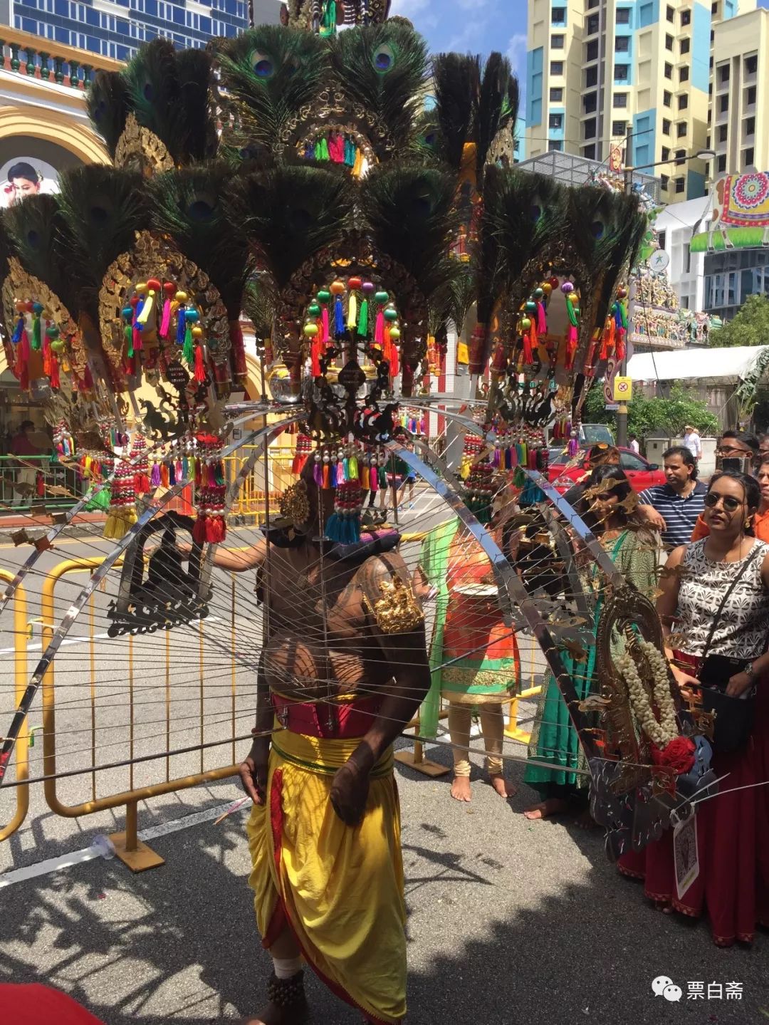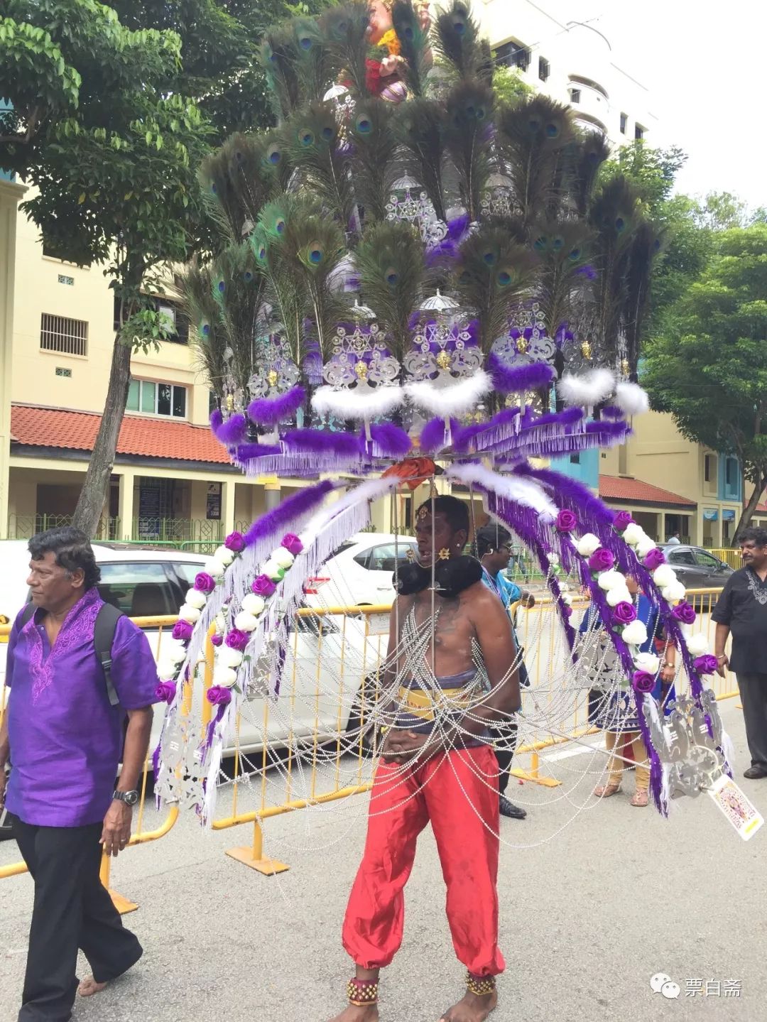 参加游行的印度人,穿着节日的盛装,男女老少都有,能看得出来很多都是一大家子出行。有的人手拿乐器,有的人手托祭品,在行进的过程中会不时停下来载歌载舞。游行队伍中,最吸引眼球的,无疑是身背各种“卡瓦底(Kawadi)”的信徒。