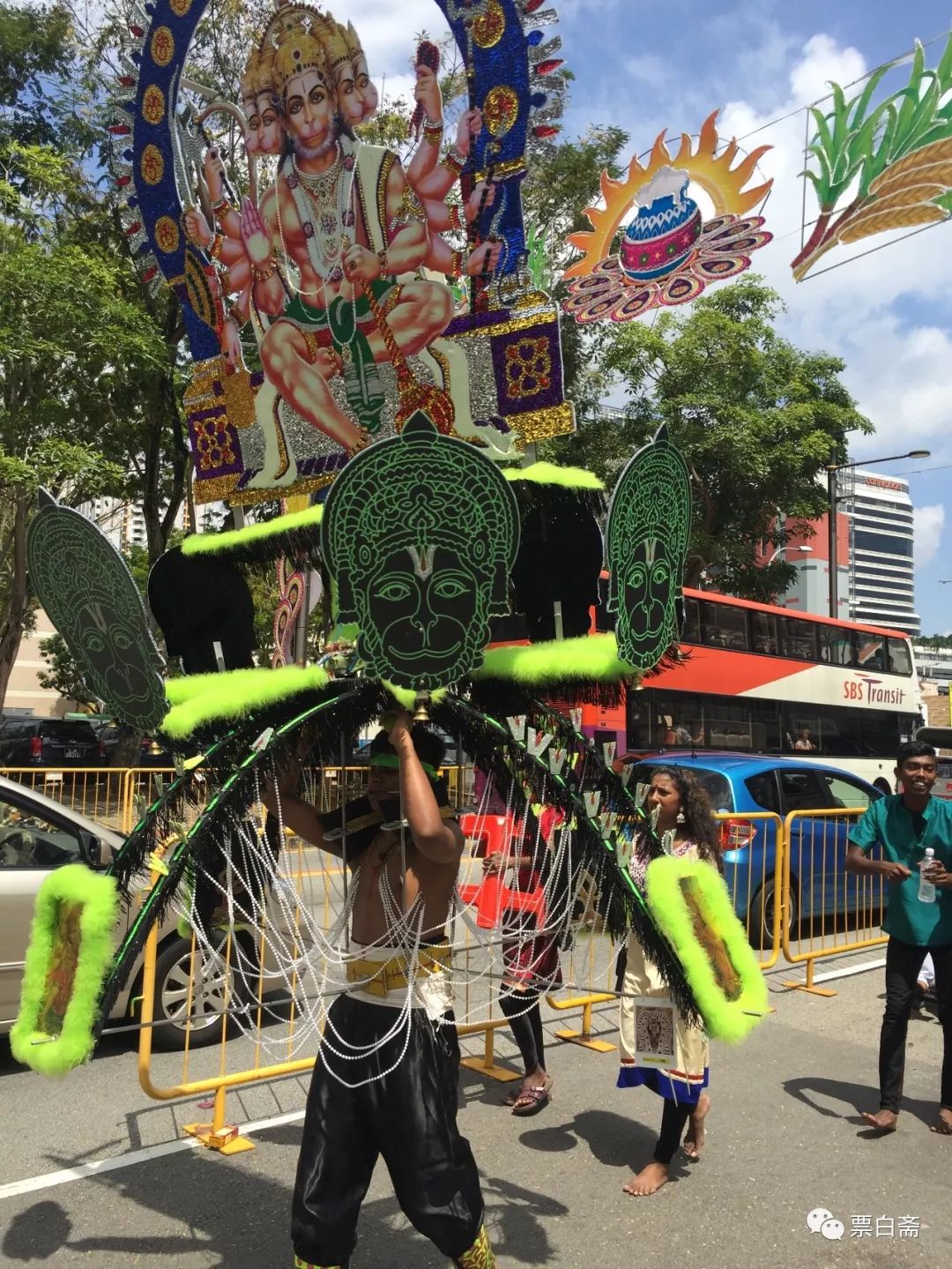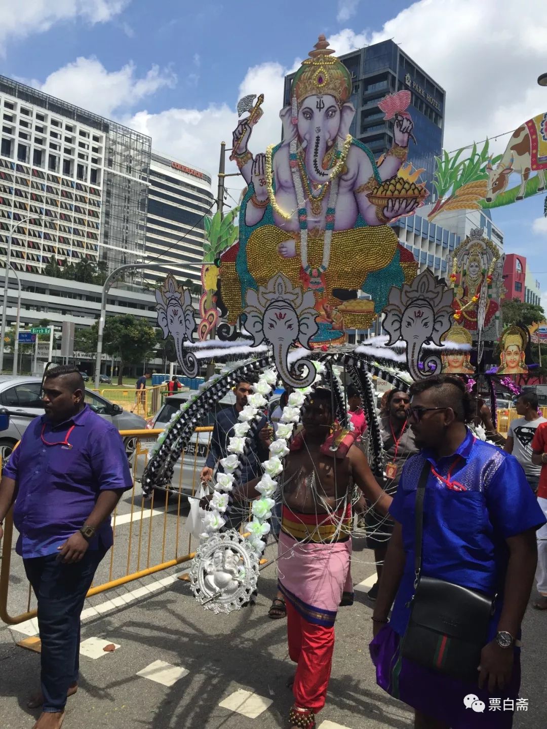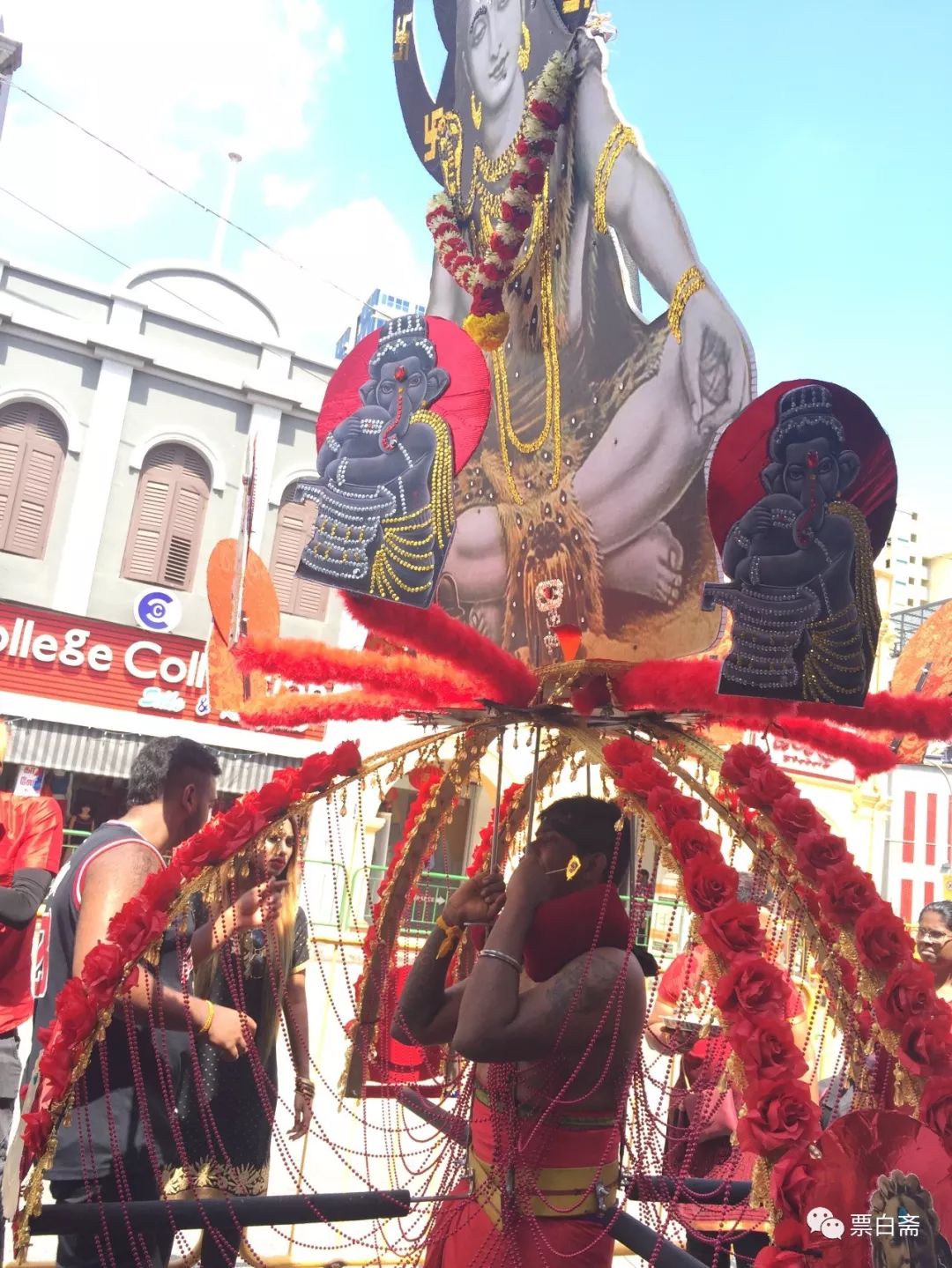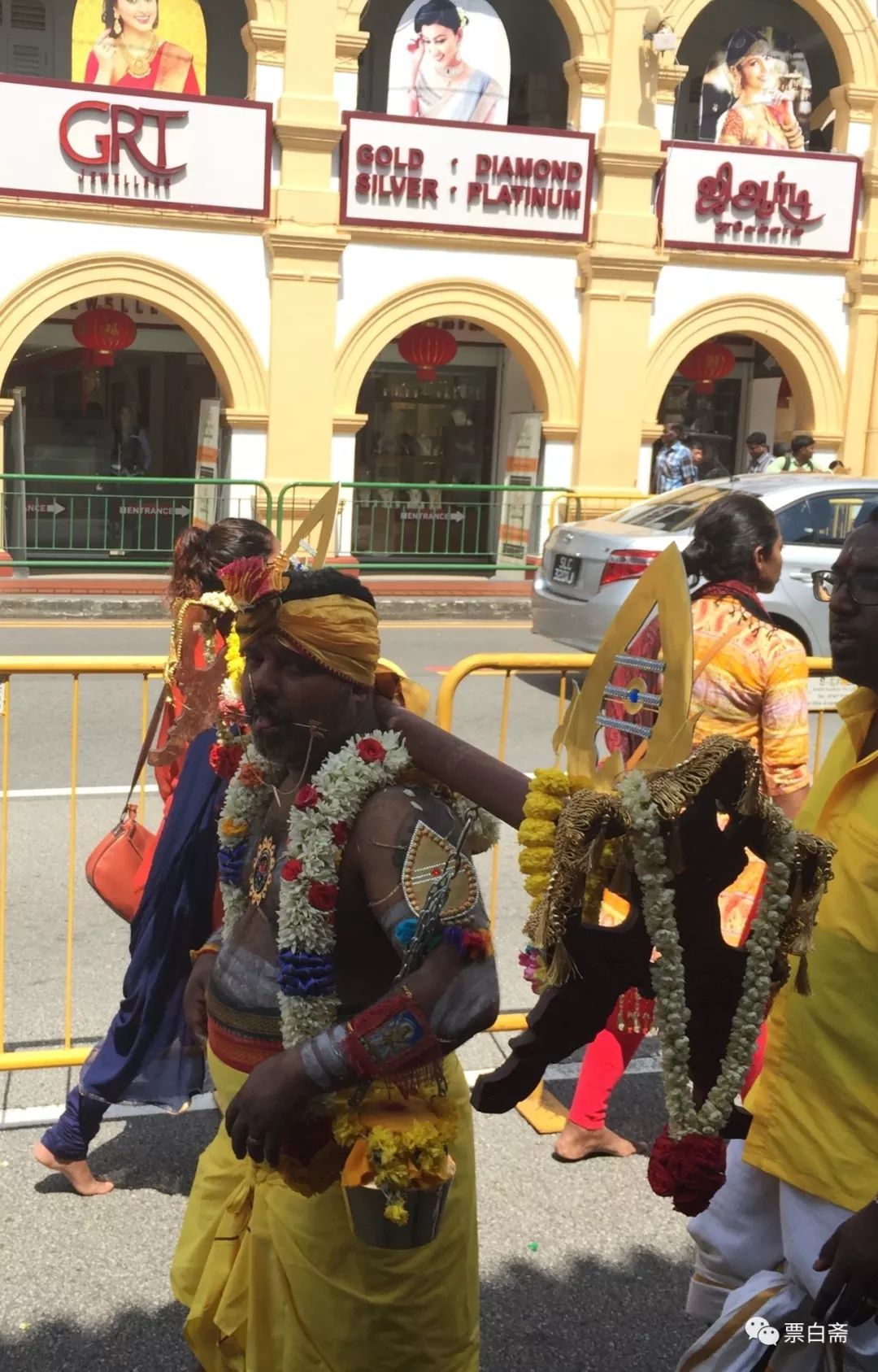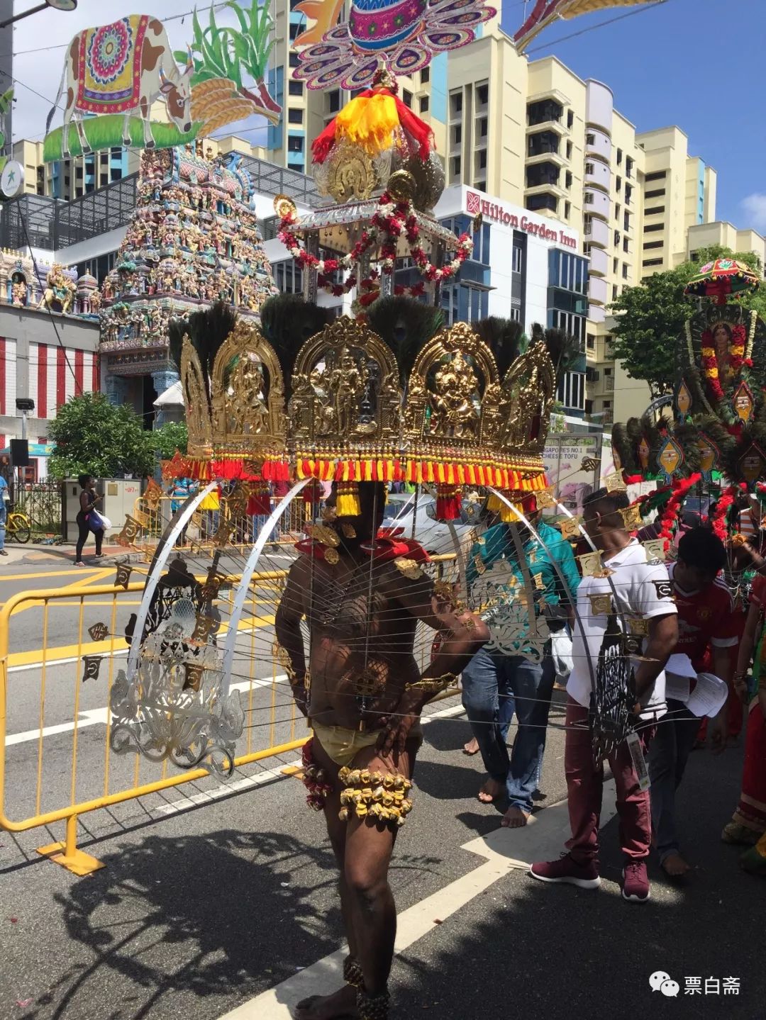 参加游行的印度人,穿着节日的盛装,男女老少都有,能看得出来很多都是一大家子出行。有的人手拿乐器,有的人手托祭品,在行进的过程中会不时停下来载歌载舞。游行队伍中,最吸引眼球的,无疑是身背各种“卡瓦底(Kawadi)”的信徒。