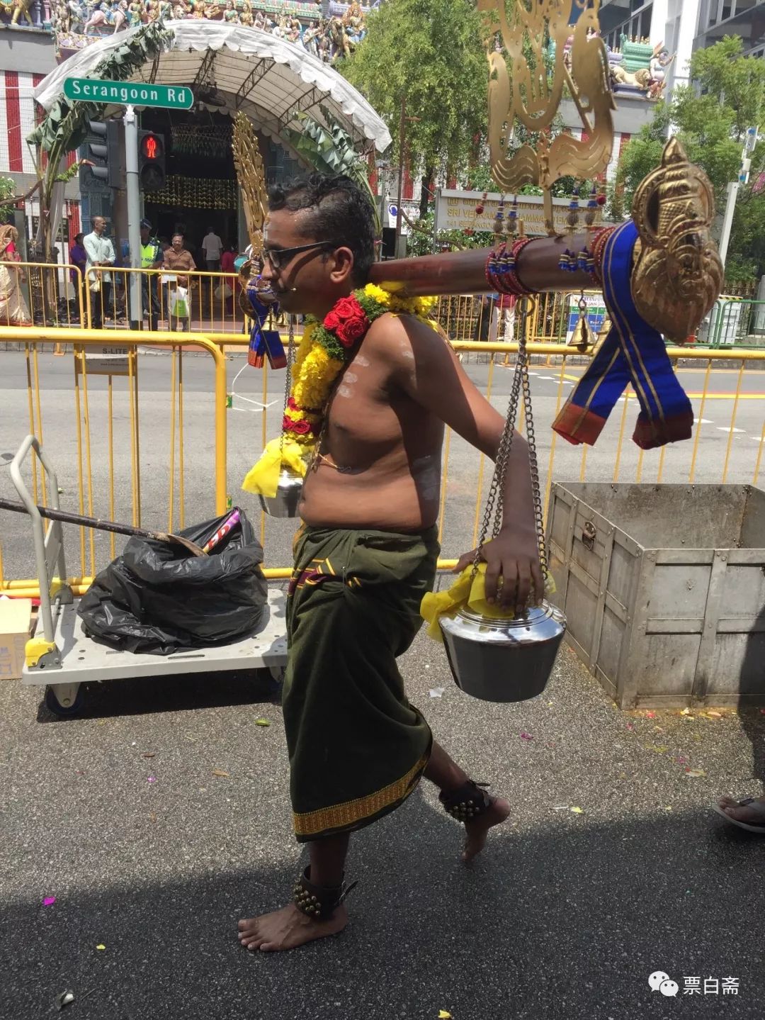 随后,信徒们要赤足徒步走完游行路线,亲友们则伴随在一旁吟唱圣歌和祷词,给以支持和鼓励。游行路线全长4.5km,穿过市区,从一座印度神庙到另一座印度神庙。