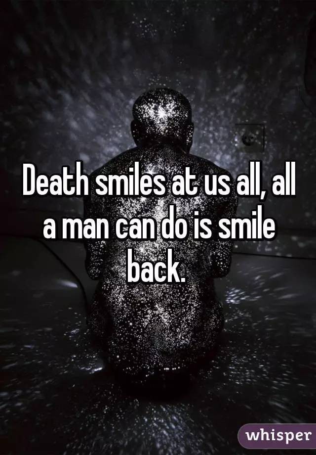 电影《角斗士》中马克西姆斯说,死亡一直在对我们微笑,而我们唯一能做的就是对它回报微笑(DEATH SMILES AT US ALL. ALL A MAN CAN DO IS SMILE BACK. )。