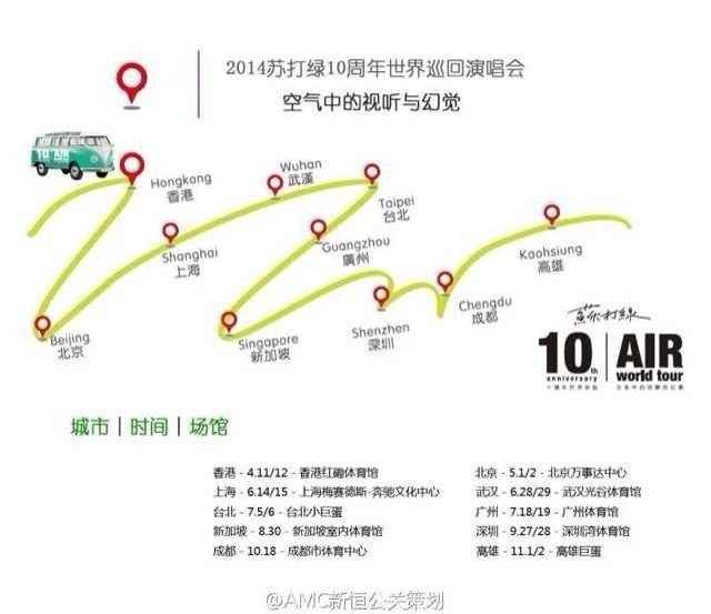2014苏打绿10周年世界巡回演唱会公布首轮10站巡演地点分别为香港、北京、上海、武汉、台北、广州、新加坡、深圳、成都、高雄;其中新加坡站开唱日期为8月30日。