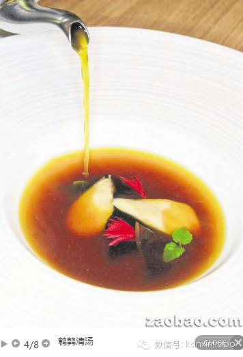 还有一道采用本地农场养殖的鹌鹑做成的清汤,厨师说花了四天时间精心炮制。先用老母鸡和帕尔玛火腿熬汤底,隔天放入干贝、陈皮、龙眼等材料,第三天放入鹌鹑骨后继续熬。期间要不断撇除浮沫、去芜存菁,汤才会清澈。上桌前加上一些鹌鹑肉和木耳。如此耗费工夫,难怪汤鲜味浓,越喝越觉得好喝。
