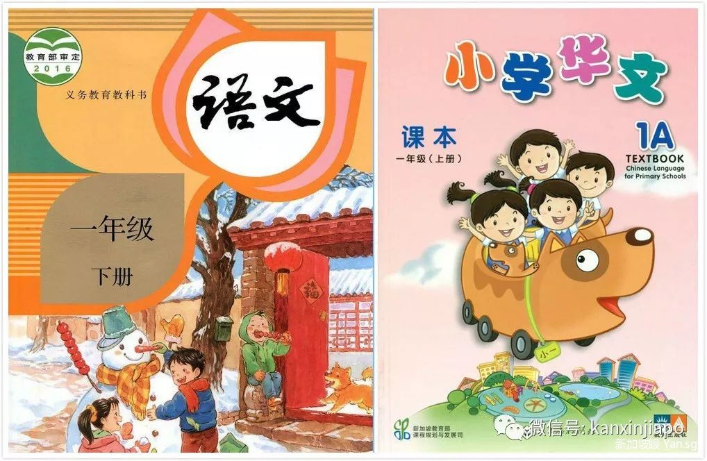▲左:中国小学语文课本 右:新加坡小学华文课本