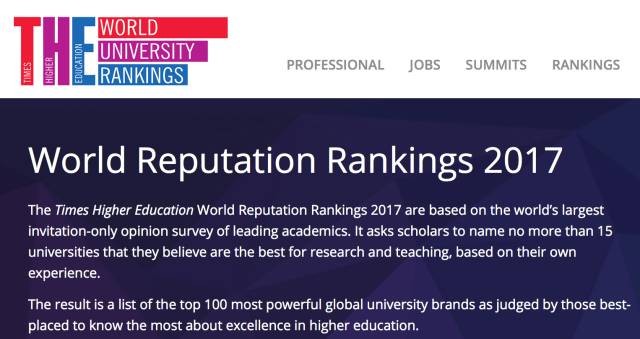 《泰晤士报高等教育副刊》(Times Higher Education)的“全球大学声誉排行榜”(World Reputation Rankings)始于2011年,作为“世界大学排行榜”的补充。榜单强调高校的品牌价值,反映各高校在吸引人才、商业投资、科研伙伴等方面的竞争力。
