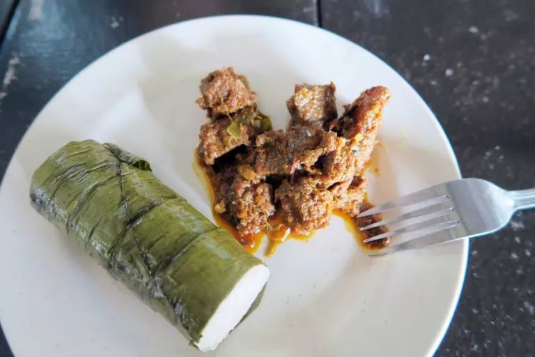 这是一种香蕉叶包裹的米糕,然后再淋上椰奶牛肉汤!