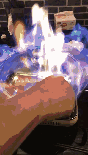 小哥把锅盖一盖,往上面均匀地洒了一圈米酒,再用打火器这么一喷,我的面前瞬间出现了一团熊熊燃烧的火焰,鱼的鲜香就在这时候流溢而出…….