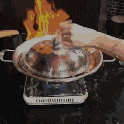 后来我才知道,其实这个手法并不是想用来炫技啦,而是“棒棒鱼”的独门秘诀,用锅底、锅内、锅盖的三层火焰充分激发鱼的美味,锁住味觉。