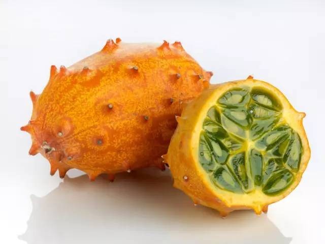 很多人第一次见到这款水果的时候,简直有种见到外星生物的感觉……刺角瓜有着坚硬的表皮和凹凸不平的小短刺,而打开之后,内部的肉质呈凝胶状,细腻且多籽,有诱人的青绿色泽,口感清甜,可以用勺子挖着吃。