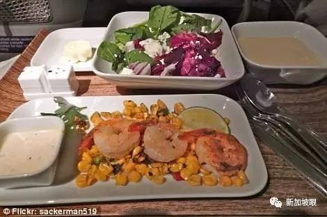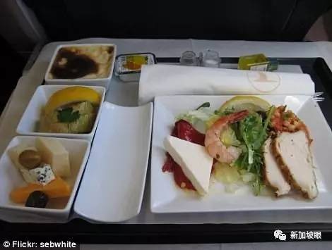 ▲商务舱就比经济舱好多了,鸡肉沙拉里还有海鲜和新鲜干酪~