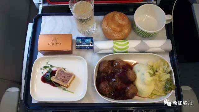 ▲相对来说,商务舱就好多了,除了肉丸很美味之外,乘机人还专门说了一句,“玻璃杯特别美”!(居然还给Godiva~)