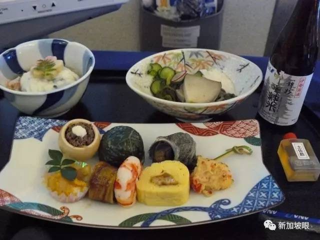 ▲商务舱的餐点则提供了精致的寿司和清酒,器皿也充满了日式风情。