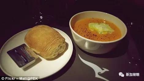 ▲在商务舱里,早餐则包含甜土豆汤配柠檬香芹奶油酱,以及面包~