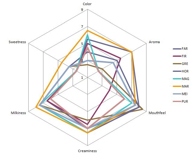 图四 新加坡全脂鲜奶感官测评雷达图 我不得不自夸一下这张图做的真是太专业了。各位看官请自找亮点。图四中六角形的顶点对应了表三中的6个测评标准。8条不同颜色的线分别代表8种牛奶品牌。我们采用的是九分评估值。1和9分别代表每个测评标准的两个极端值,在表三中有具体描述。举例说明,如果您想知道谁家的产品喝起来奶味最浓,请看雷达图的左下角(milkiness)。Marigold的得分最接近9,说明它的奶味最接近直接吃奶粉的感觉。而Pura相对最低。但事实上他们的绝对得分都在6到8之间,相差其实不大。