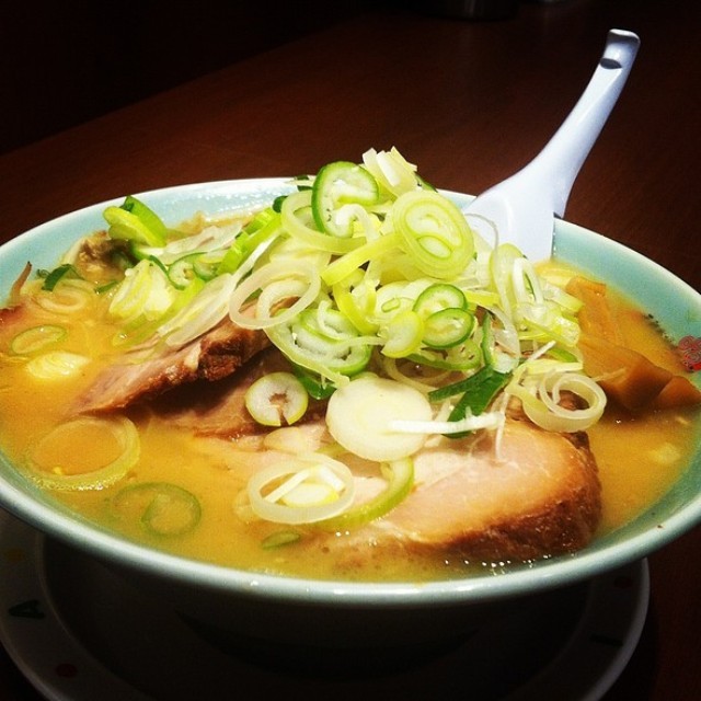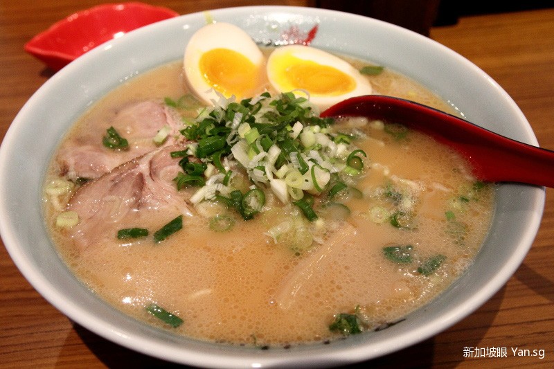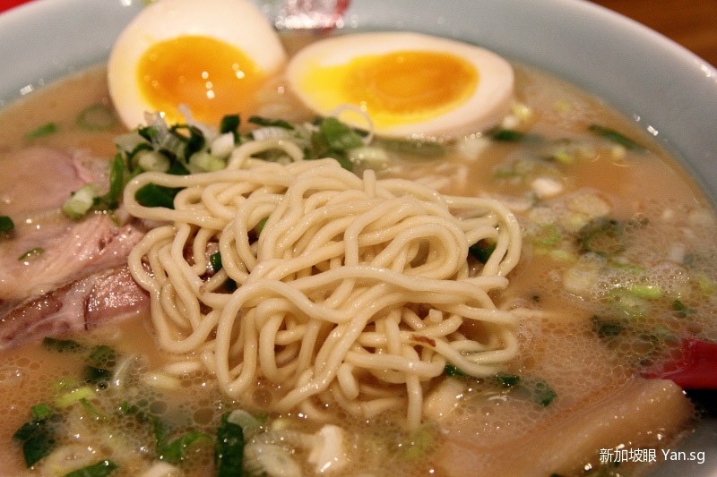 拉面同样以三种汤头为主,分别为酱油,味噌与盐味,据同行友人说酱油拉面是日本总店的「名物」, 可是论卖相已扣了不少分数。汤底较混浊, 脂肪亦较多, 以豚骨﹑ 鸡﹑ 昆布加上鱼干熬煮的海陆风味汤头,相较于一般的豚骨汤来说,口味比较不油腻也相对清淡些。酱油汤头比起盐味汤头来说,颜色要深一些,口味则是盐味基底的汤加上了些酱油的甘甜味,风味清爽,并不过于咸腻,喝起来多了一份丰厚感。我觉得颇适合新加坡人的口味,就以我的口味来说,即使整碗汤喝完也不觉太咸,当然也许是我比较重口味的关系。面条使用细面,煮得口感较硬,面心有劲。叉烧肉大概是肥三瘦七,或许是梅花肉的部位,瘦肉部位干硬些,肥肉部位自然肥嫩点,滋味普通,但胜在清爽不腻。