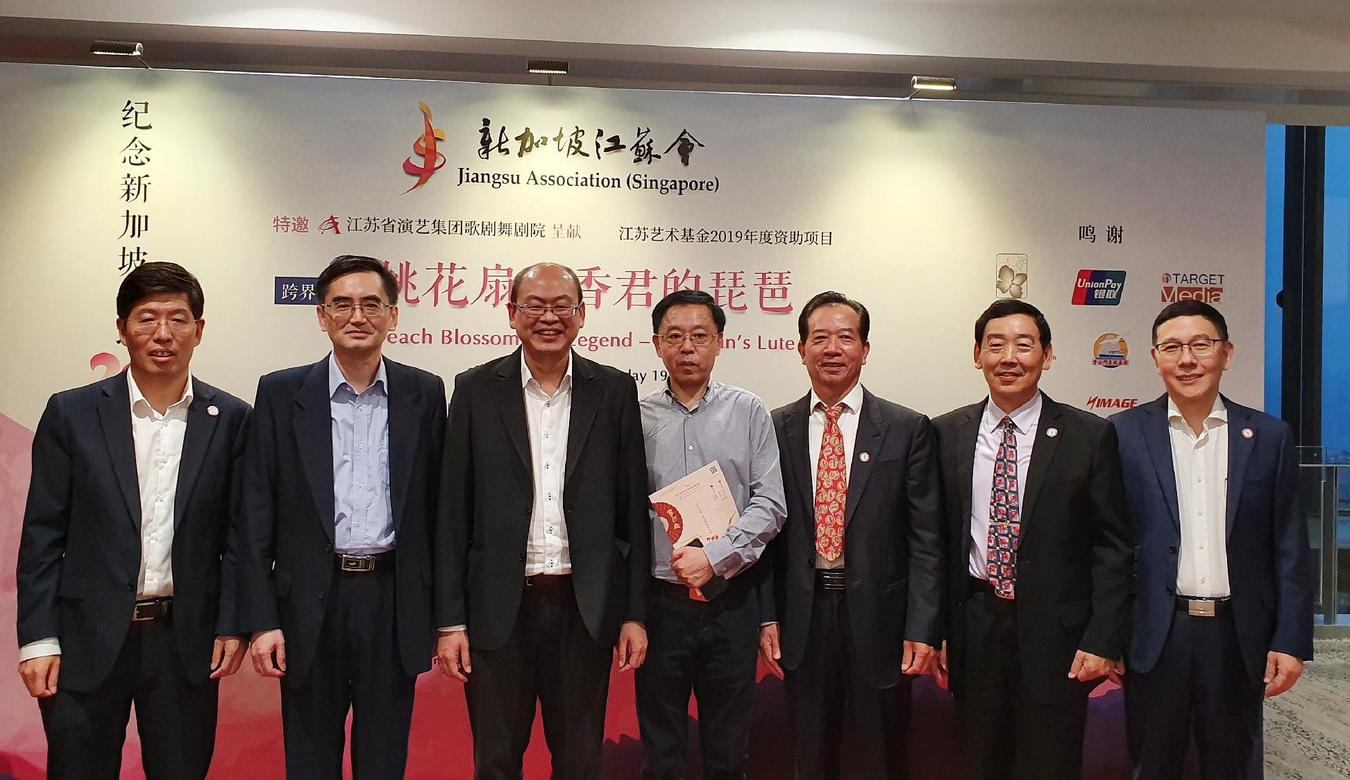 从左至右:新加坡江苏会副会长兼秘书长曹林博士、中华人民共和国驻新加坡大使馆文化参赞阙小华、新加坡蔡厝港集选区国会议员余家兴、中国文化中心主任兼中国驻新加坡旅游办事处主任肖江华、新加坡江苏会副会长丁文锦、副会长华佑南博士、副会长江建平博士