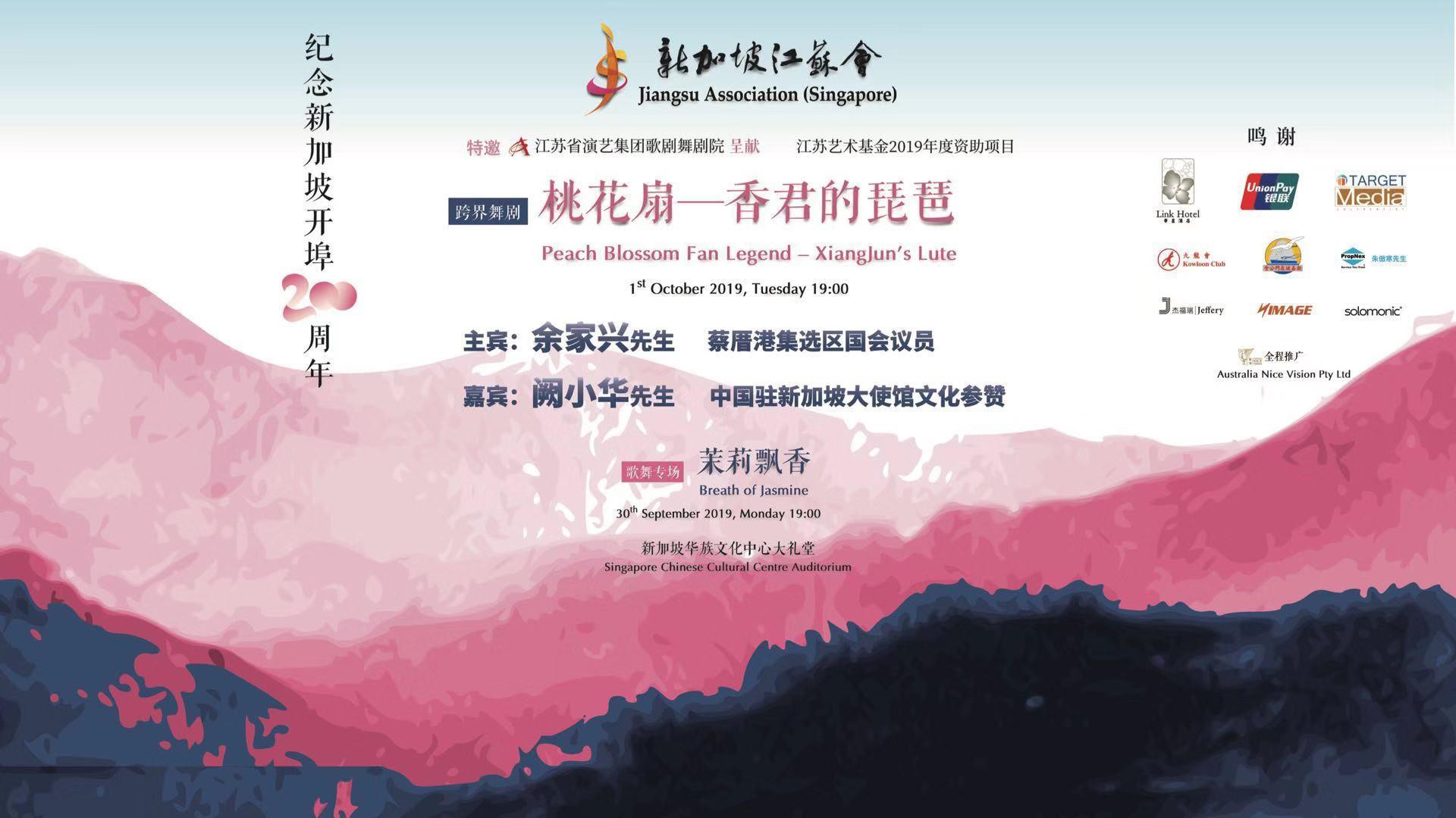 为纪念新加坡开埠200周年,感念先辈们的不屈不挠与坚韧付出,同时也庆祝新加坡江苏会成立三周年,新加坡江苏会特地邀请到中国江苏省演艺集团歌剧舞剧院,来新呈献《茉莉飘香》歌舞专场和跨界舞剧《桃花扇—香君的琵琶》。
