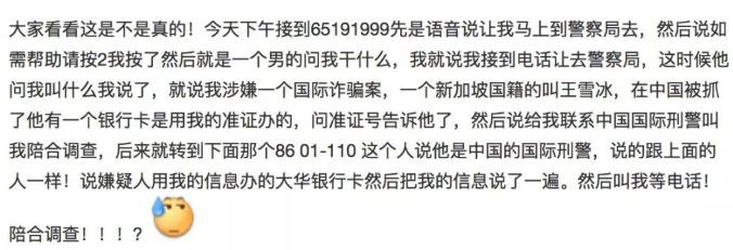接到电话后,“官员”让这位网友立马到警察局,或者按2来寻求帮助。网友拨键后,“警察”告诉她卷入了国际诈骗案,有人用她的准证办理了银行卡进行诈骗。需要联系中国国际刑警沟通,这名“中国刑警”可以准确地报出网友的姓名等个人信息。
