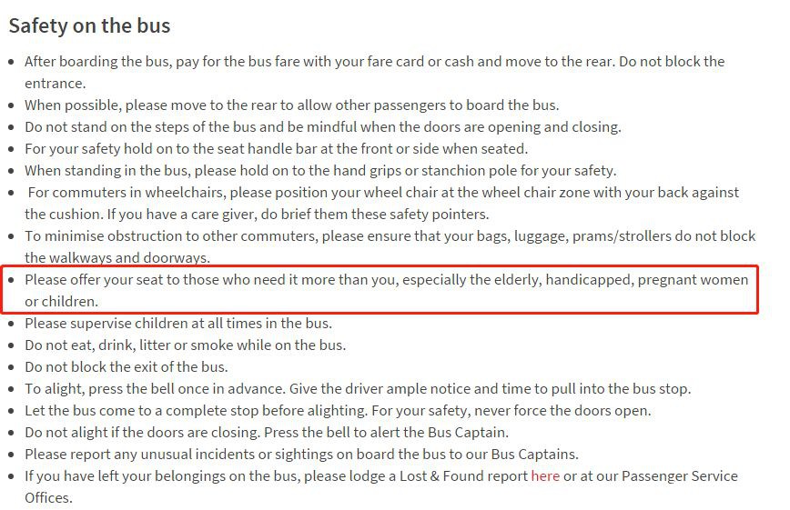 连新加坡地铁有限公司(SMRT)的安全指导原则上也只是建议民众让位给那些比自己更有需要的人。