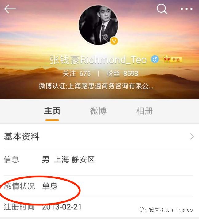 微博个人主页显示的感情状况目前还是“单身”。