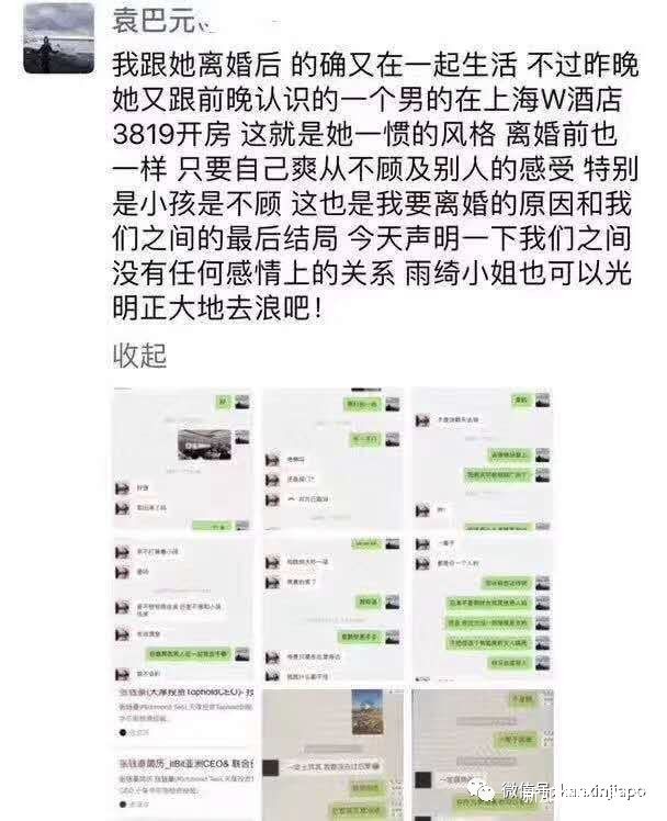今天(1月6日),袁巴元在朋友圈爆料,和张雨绮离婚后,俩人还生活在一起。并且称前妻和刚认识两天的新加坡男人开房~