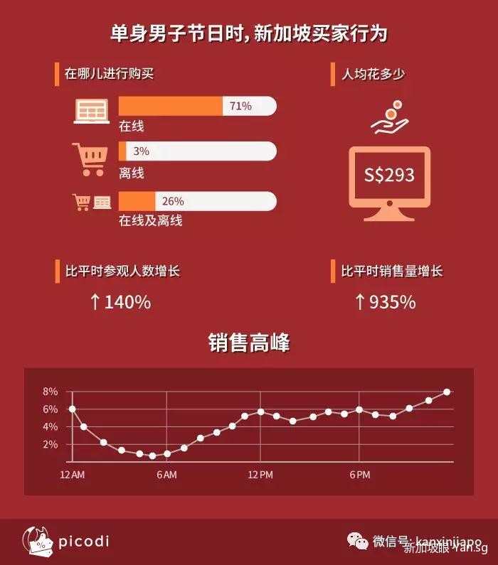 新加坡人在单身男子节日时间比平时积极些购物事实并不奇怪。据我们内部统计,在线购物数量比平时增长 935%。据调查数据,促销活动时新加坡人准备花S$293。11月11日销售高峰是晚上11点,这件事具有象征意义。