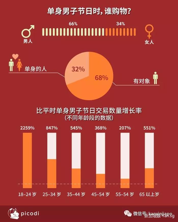 年轻新加坡人对单身男子节日特别感兴趣。如果比平时做对比,11月11日18-24年龄段购物数量增长2200%。其他年龄段购物数量也大大增长。