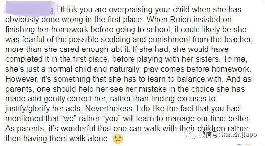“我认为你在孩子明显犯错时,太过夸奖她了。当她上学前坚持在家写作业,可能是因为害怕老师的惩罚,而不是真正关心作业是否完成。如果她真的关心,就应该在玩耍前完成它。对我来说,她只是一个再正常不过的孩子,做作业前玩耍,但她需要学会作出平衡。作为父母,需要帮助她认清错误并温和地改正,而不是找借口去美化他的表现。不过我非常喜欢你指出一点,就是“我们”而不是“你”需要更好地管理时间。作为父母,陪伴孩子成长比让他们独自成长好太多。”