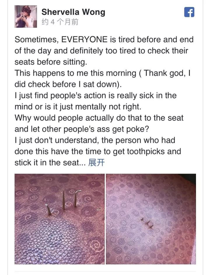 关于新加坡公共交通的投诉,先不说一向层出不穷:三天两头bug的MRT,东西南北线一起坏;全岛200万人受影响,这也许是新加坡最严重交通故障。单说巴士,光天化日之下出现“色狼”(详见新加坡国大女生自述:在巴士上遇到色狼的全经历);还有今年的8月,竟然有一名60岁男子,故意把牙签插在巴士座椅上!