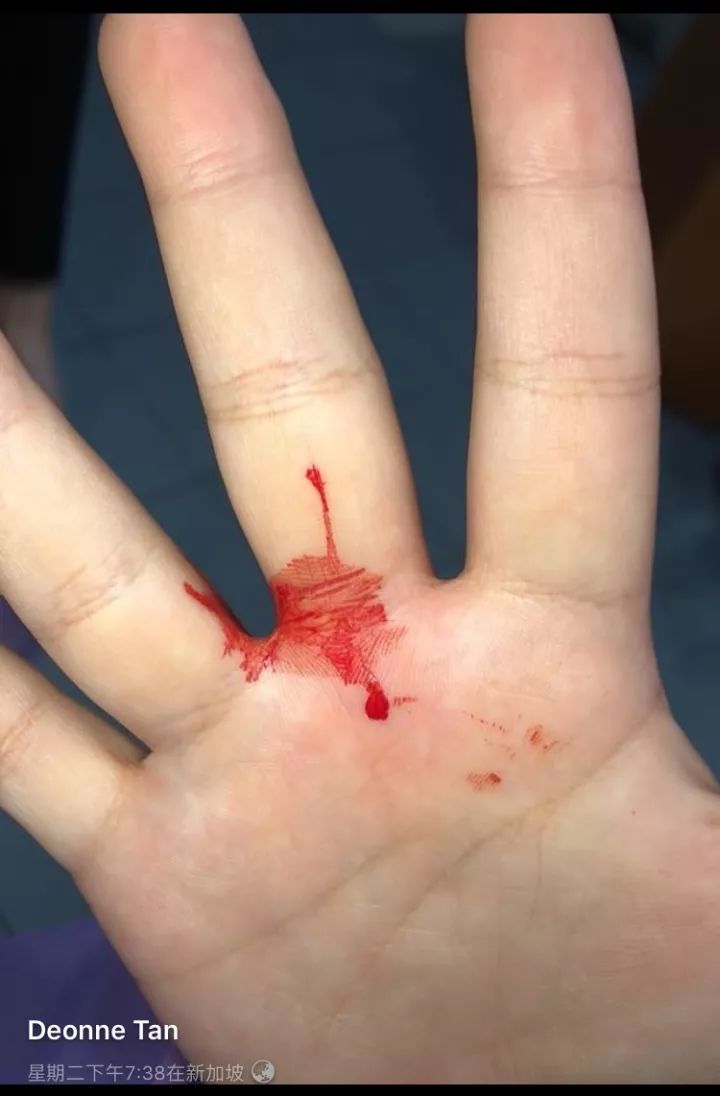 10月31号,一名18岁的义安理工女生与姐姐,在乘坐巴士时被“不明物体”刺伤手掌,瞬间鲜血直流……