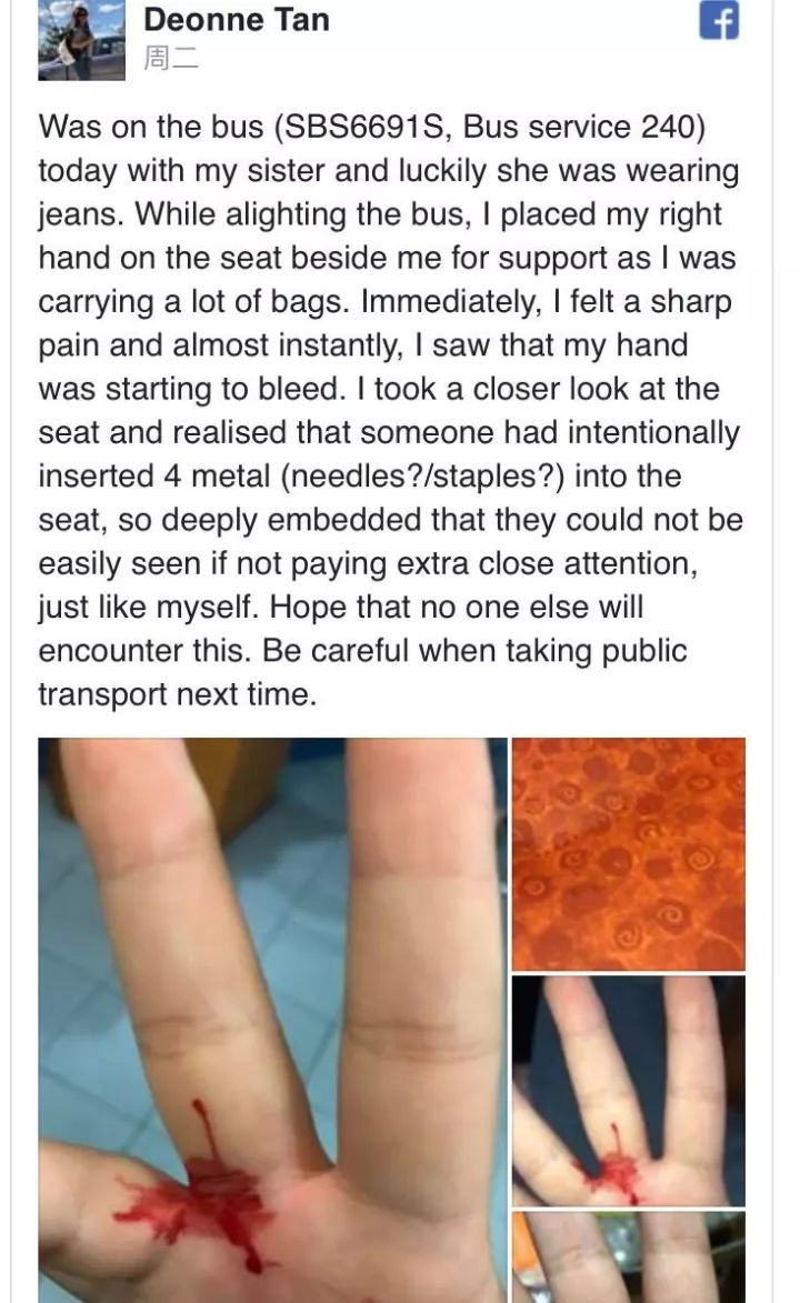 这名受伤女生Deonne Tan 当天与姐姐一起乘坐240号巴士。下车时,她用手掌撑着座椅起身,瞬间感到一阵刺痛,接着便发现有鲜血从指缝间流了出来。