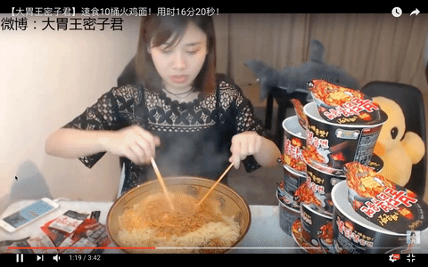 密子君的食量极为惊人,10桶火鸡面嗖嗖进肚,简直不要太小case!你要是觉得食欲不振,可以看密子君吃饭,看她吃那么香,就立刻有了觅食的动力。当然,也有可能会让你食欲更不振,看她吃你就觉得饱了,哦不,是撑了……