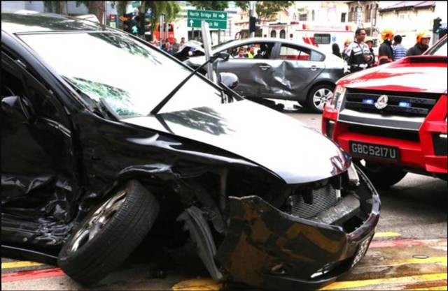 当时,一辆黑色的多用途轿车(MPV)正从惹兰苏丹往美芝路直行。另一辆从维多利亚街开往加冷路的灰色汽车,疑似闯红灯,拦腰猛撞经过十字路口的MPV。撞击后,灰色汽车继续路中央的红绿灯冲去,把灯柱“铲”倒。MPV被撞后,车子同样失控转了180度,车头右边严重损坏,轮胎几乎脱落。