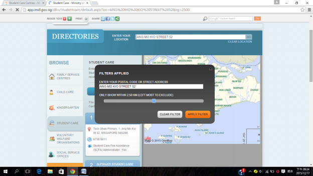 去哪里找?你可以直接在MSF的网站里找:点击APPLY FILTER,输入你要找的地点和距离要求。网站自动过滤出一些选择。http://app.msf.gov.sg/dfcs/studentcare/default.aspx