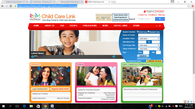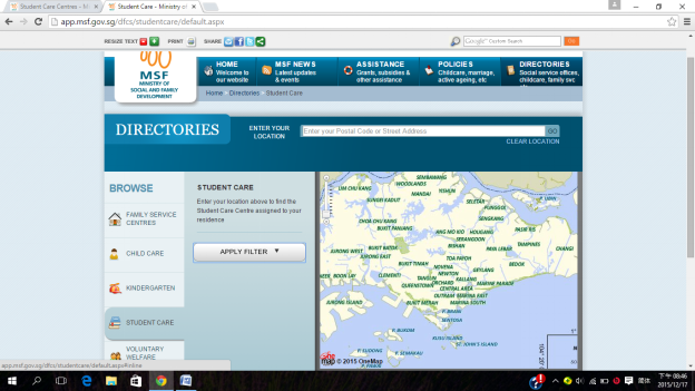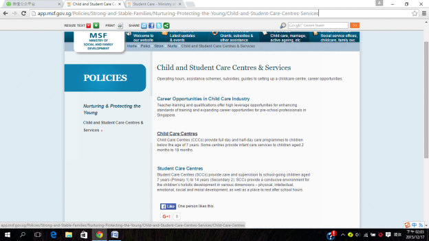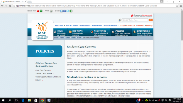 在新加坡生活的基本技能之一就是要学会用google,国内是“知之为知之,不知百度之”,也是同样的道理。网络时代信息爆炸,如今所需要的很多信息基本都可以在网上查到一二。搜关键字“student care centre”,蹦出来一个网站: http://msf.gov.sg 是“新加坡社会和家庭发展部”的官方网站。这是新加坡政府的一个下辖部门。它主要目标是培养强大的家庭和一个充满爱心的社会。原来叫“新加坡社会发展、青年及体育部“,2012年11月1日,重组改成”新加坡社会及家庭发展部”。专门管社区服务、幼儿园、托儿所、托管、婚姻问题、津贴补助等等有关加强社会安定团结的事宜,以及帮助需要帮助的人。其实基本上想要了解的一切相关信息,这个网站上都很详细地罗列了,这里必须赞一下新加坡的政府机构和官网,公开透明,事无巨细,分门别类,查找起来非常方便。可是尽管如此,还有很多人不懂英文,或者不善搜索信息,没关系,我来分享!