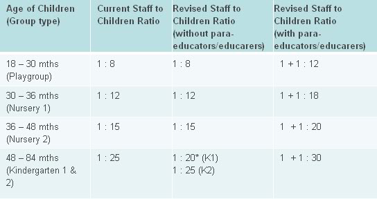 托儿机构的一切规章制度都详细地被MOE控制和定期审核,三天两头发通知给家长,教育家长如何照顾好孩子,如何了解孩子的成长规律、心理健康,如何配合老师,甚至教育孩子如何洗手都发通知,这一点,真是不能更赞。每个班都会有一名英文老师和华语老师,每间幼儿机构都有一些印度籍、华裔、私立的更多菲律宾老师(东南亚式的国际化),条件好的甚至还有洋人老师。每个年纪段的班级,师生配比都不一样。老师和孩子的比例严格按照MOE的要求来,班级年龄越小,老师学生配比的数字越小。比如,N1,1个老师最多带12个孩子,如果有一个协助的预备老师,最多不超多18个孩子。具体参见下图。