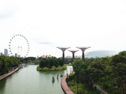 傍晚约在滨海湾见面,这是新加坡最负盛名的的地标景点,是世界著名的人工艺术建筑群,也是每个游客的必游之地。远远看见三座连成一串的金沙酒店,威风凛凛地矗立于天地之间,绿意盎然的空中花园格外耀眼,磅礴的气场俯瞰群雄,身边建筑都黯然失色。与此相得益彰的是,莲花盛开的科学博物馆,和另一边遥遥相望的滨海湾花园,别具一格的擎天大树闪耀着这个城市的繁华。