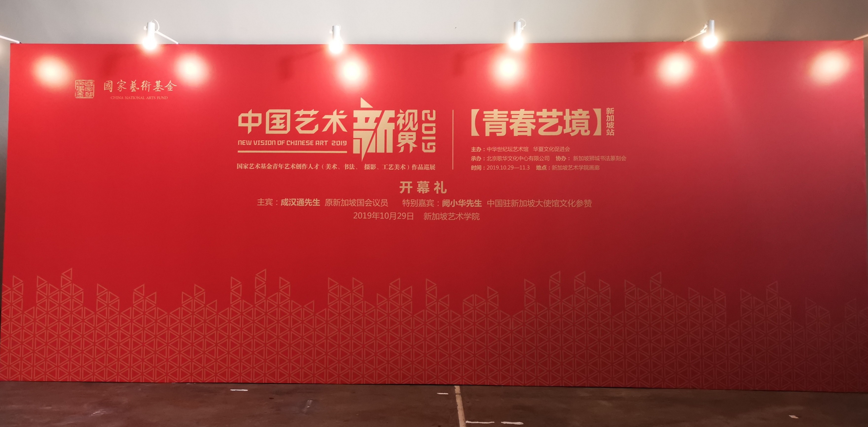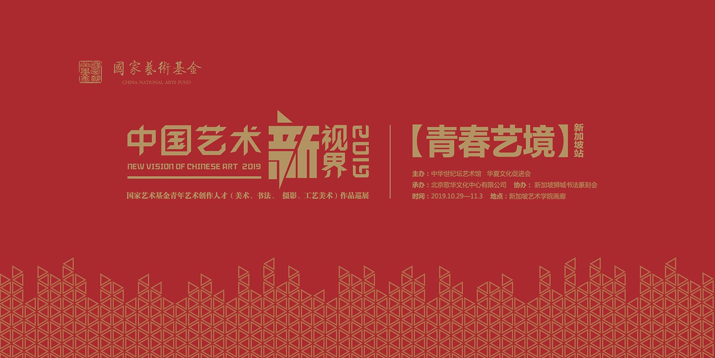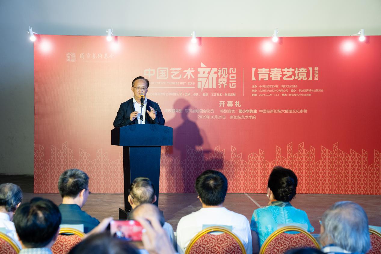 10月29日下午,“中国艺术新视界2019”——国家艺术基金青年艺术创作人才(美术、书法、摄影、工艺美术)作品巡展走进狮城新加坡,在新加坡艺术学院画廊隆重开幕。此次巡展以“青春艺境”为主题,由华夏文化促进会、中华世纪坛艺术馆联合主办,北京歌华文化中心有限公司承办,新加坡狮城书法篆刻会协办。