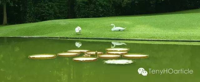 公园中心有一片大湖,湖边有一对天鹅夫妇悠然自在的湖边嬉戏。