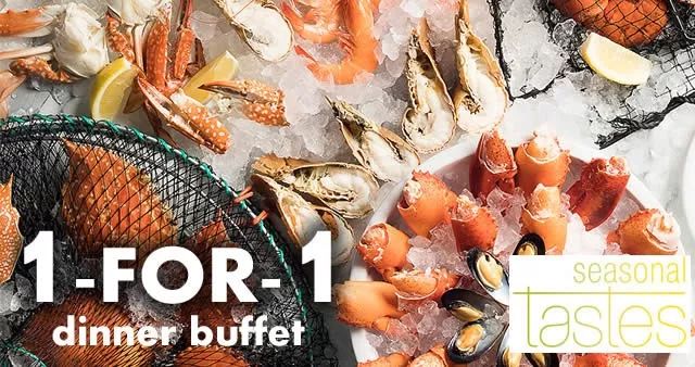 凭DBS / POSB卡享受买1送1自助晚餐,品尝各式海鲜和令人垂涎的美味菜肴。