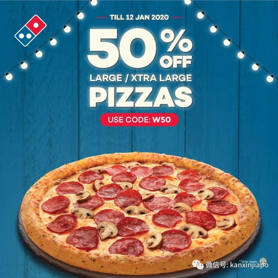 多种口味的大号和超大号Pizza使用促销代码“W50”可享有半价折扣!