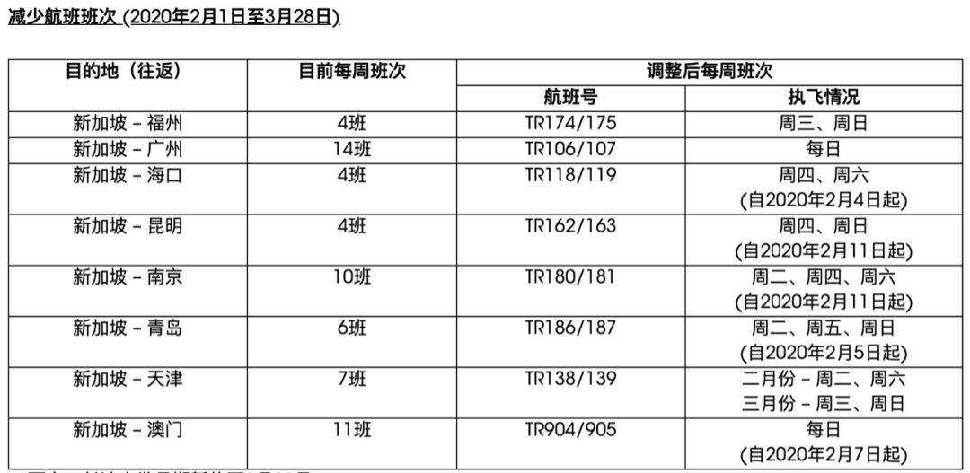 预计将减少从新加坡到北京、上海、广州、深圳、厦门、成都和重庆等城市的部分航班。