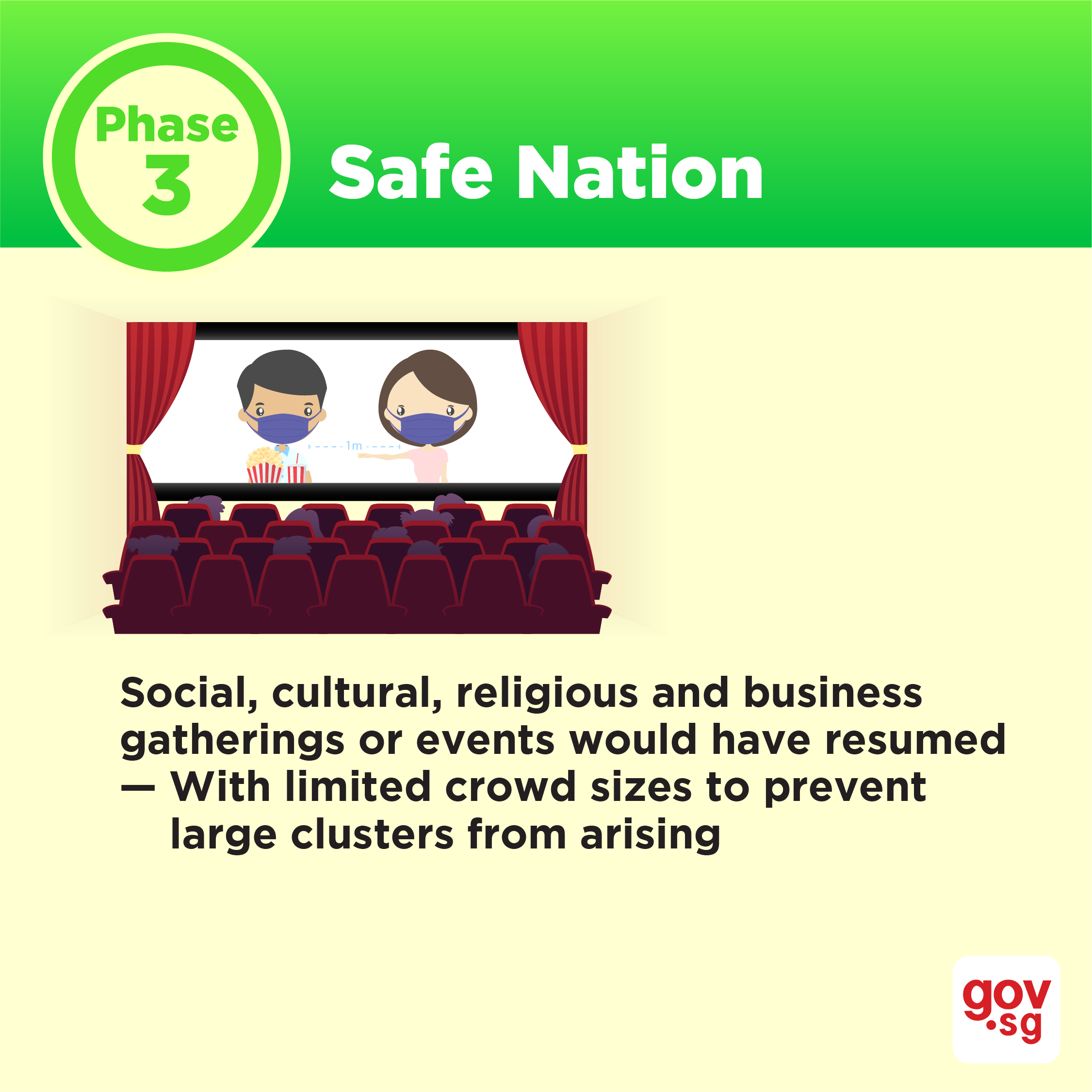 Social, cultural, religious and business gatherings or events would have resumed. However, sizes of gatherings will have to be limited. Services and activities involving significant prolonged close contact, or crowd management risks in an enclosed space, would be reopened. These include spas, massages, cinemas, theatres, bars, pubs and nightclubs. Seniors can safely resume day-to-day activities, while ensuring safe distancing and avoiding crowded places.