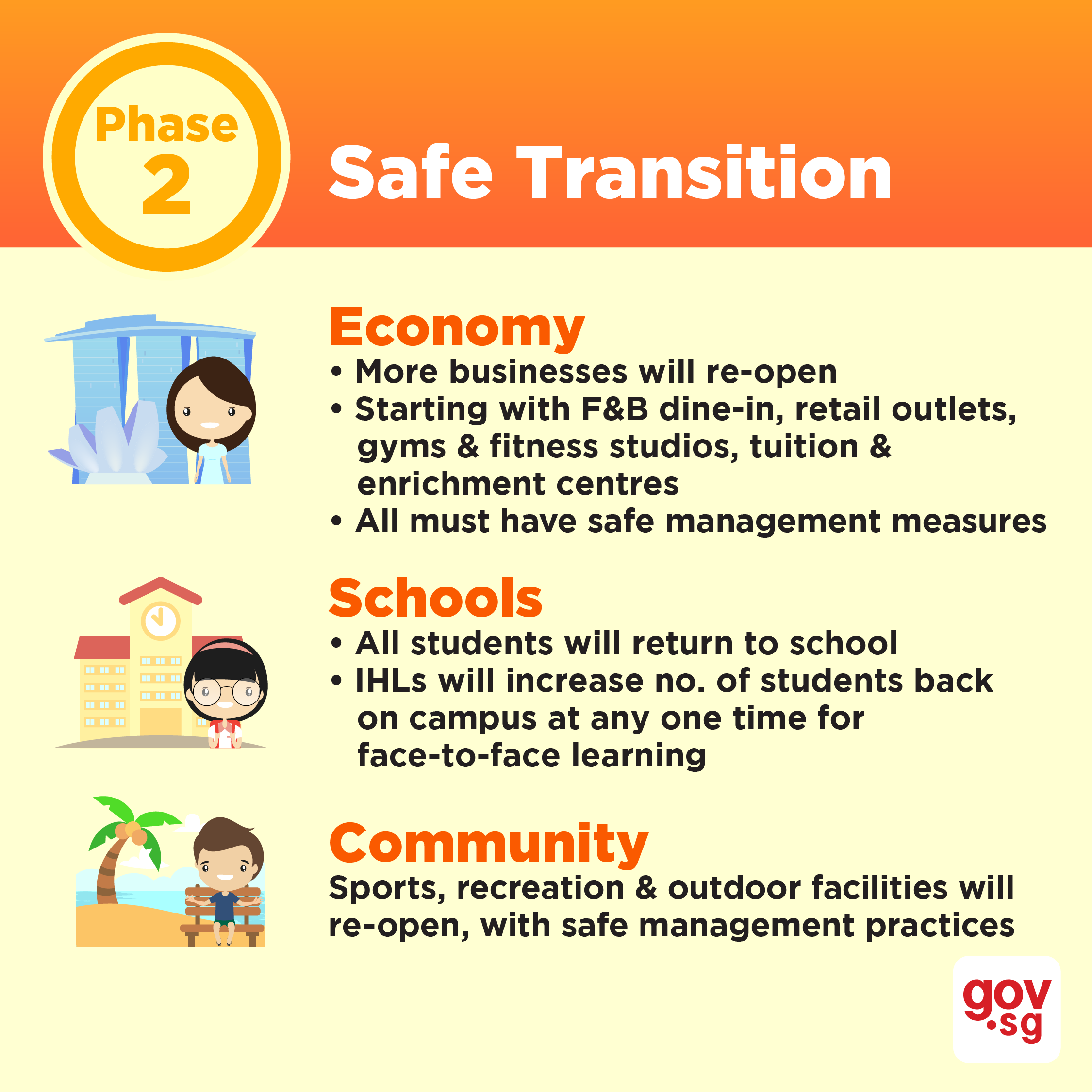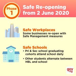 Resuming social activities in small groups Reopening more businesses with safe management measures in place. These include F&B dine-in services, retail outlets, gym and fitness studios, and tuition and enrichment centres. Allowing all students to fully return to schools, and more students on campuses of institutes of higher learningReopening sports, recreation, outdoor facilitiesPhase Three: Safe NationIn this phase, Singapore would have reached a new normal. We will likely remain at this state until an effective vaccine or treatment is developed. It is expected that: