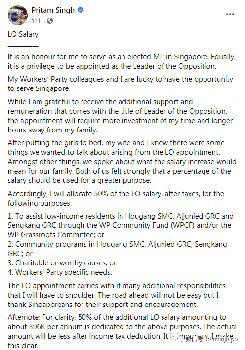 新加坡反对党领袖:每年议员津贴38万新币,捐出一半!