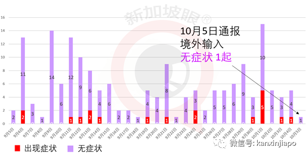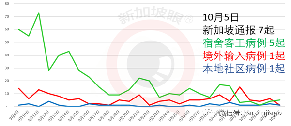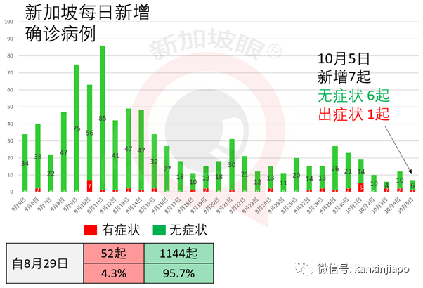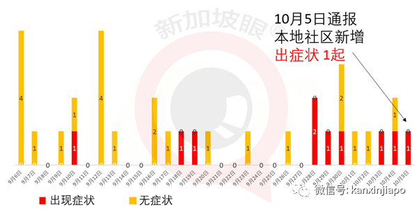 从8月29日至10月5日,新加坡一共出现1196起病例,出现症状的有52起,占4.3%,其余95.7%为无症状,有1144起。 10月5日,卫生部通报无新增感染群,也没有出现与现存感染群有关联的病例。 自9月15日起,连续21天无新增感染群,希望能维持零新增。 社区病例昨增1起为15岁私校学生