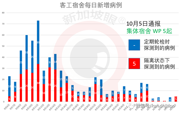 昨天通报境外输入病例1起,为50岁男性新加坡永久居民PR(第57062例),在指定地点执行14天居家通知SHN时,检测结果呈阳性而于10月4日确诊。 客工宿舍昨增5起皆为集中隔离状态下确诊 10月5日,新加坡卫生部通报,住在大型集体宿舍和工厂改建宿舍的客工(WP)新增确诊5起,皆为先前病患的密切接触者,确诊之前处于集中隔离状态,皆无症状。
