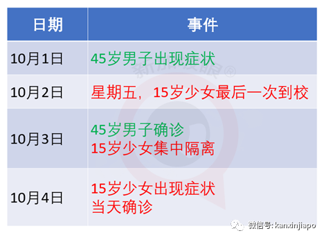 10月5日,卫生部通报本地社区病例新增1起:15岁印度籍少女(第57968例),是新加坡一所私校的学生,是第57953例的密切接触者。第57953例是45岁印度籍男子,10月1日出现症状,10月3日确诊。 10月2日,15岁少女最后一次到校;10月3日,第57953例确诊,她身为密切接触者,被集中隔离;10月4日,她出现症状,当天确诊。