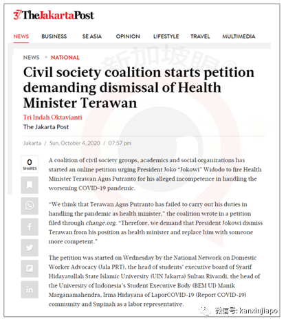 《雅加达邮报》报道,一个由民间团体、大专学府及社会组织组成的联盟发起网上联署行动,呼吁总统佐科罢免卫生部长特拉万。 请愿联盟的网上声明称,卫生部长特拉万从一开始就轻视冠病疫情,没有认真对待防疫工作,也没有能力解决疫情带来的诸多问题,如保护医疗工作人员以及遏制病毒传播。 印尼全国抗击冠病小组成员索尼说,印尼医疗设施有限,如果不尽快遏制冠病传播,医疗系统必将不胜负荷。 印中研发疫苗千余人无不良反应